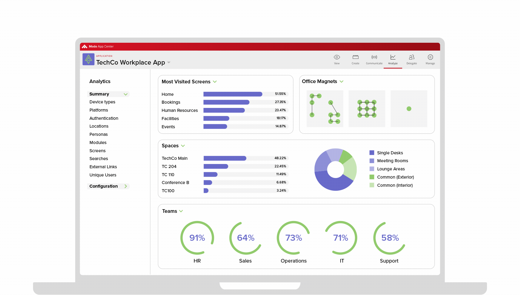 Streamline desk and room bookings with Modo Bookings™, powered by smart, connected workplace tech that gathers real-time data, delivers space utilization insights, and drives continuous efficiency through intelligent analytics.