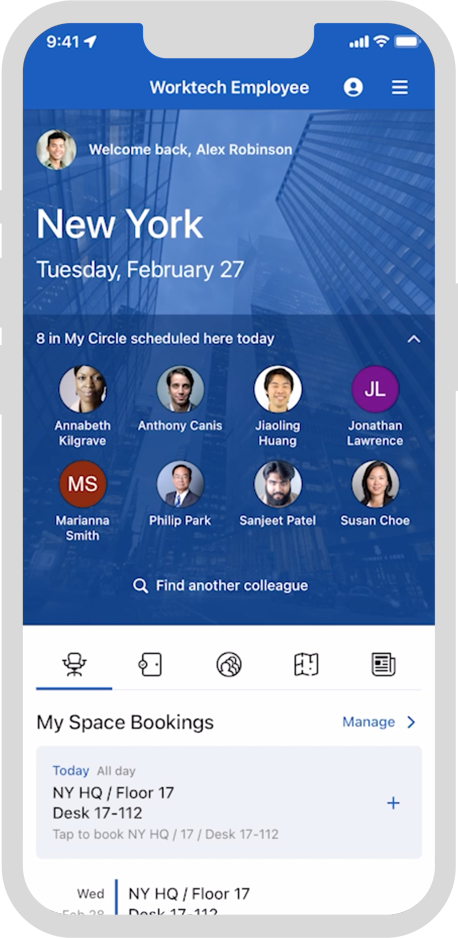 - Find team members in “My Circle™,” check available desks in real-time, and book from the map on their behalf.