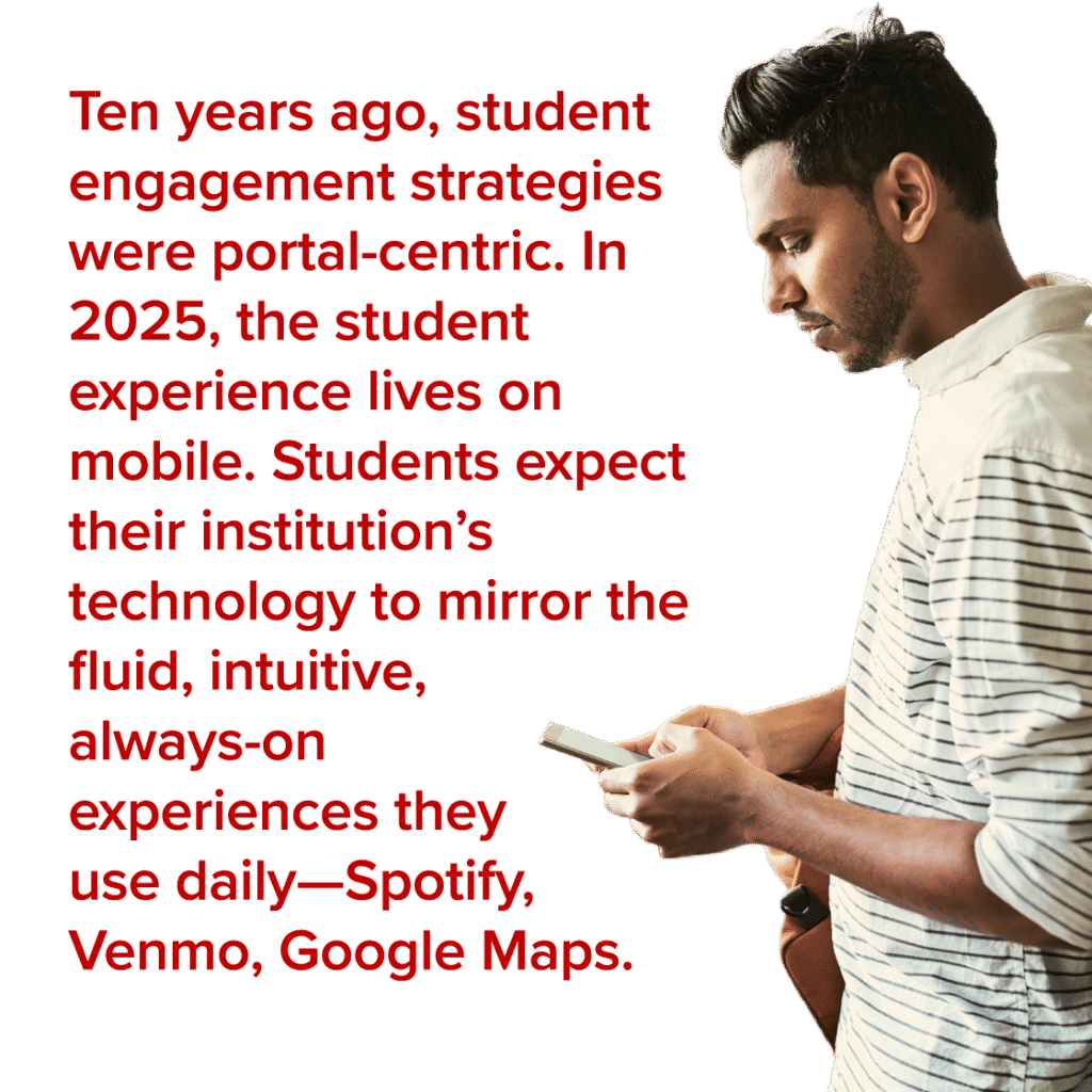 Ten years ago, student engagement strategies were portal-centric. In 2025, the student experience lives on mobile. Students expect their institution’s technology to mirror the fluid, intuitive, always-on experiences they use daily—Spotify, Venmo, Google Maps.